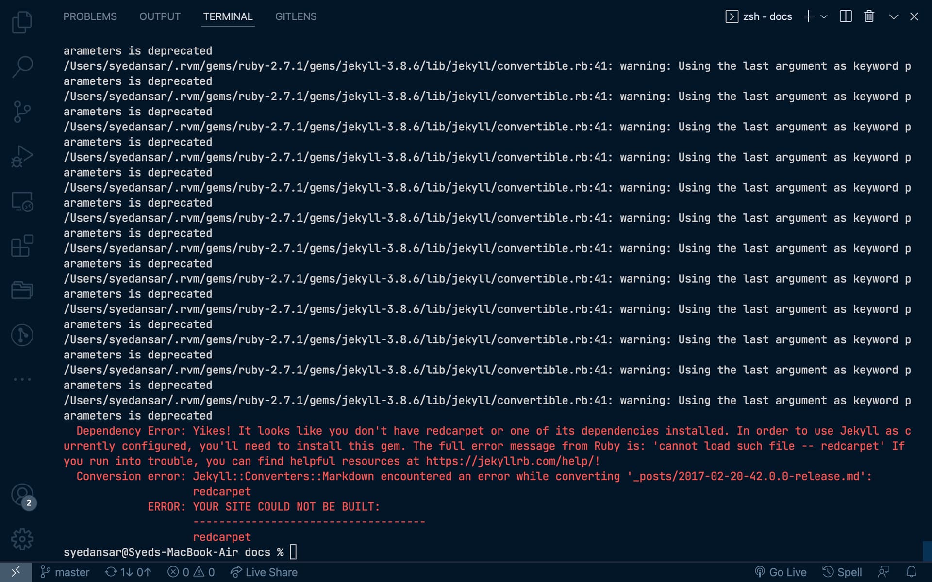 If you have a Gemfile, add redcarpet to it and upgrade to jekyll-3.9.2:
